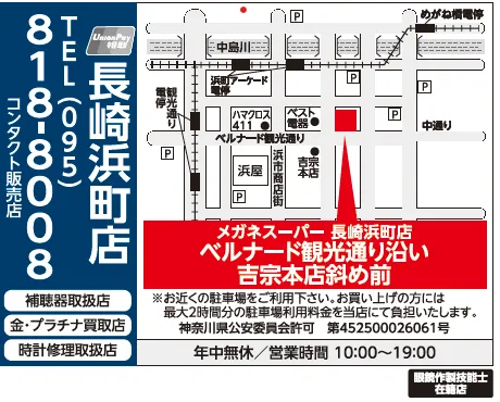 ・諌早市方面からのお越しの方、国道34号線を長崎市方面に向かって頂き、馬町交差点を左折して頂くと 浜町アーケードに到着いたします。(長崎バイパスを使用する場合、馬町交差点をまっすぐ)