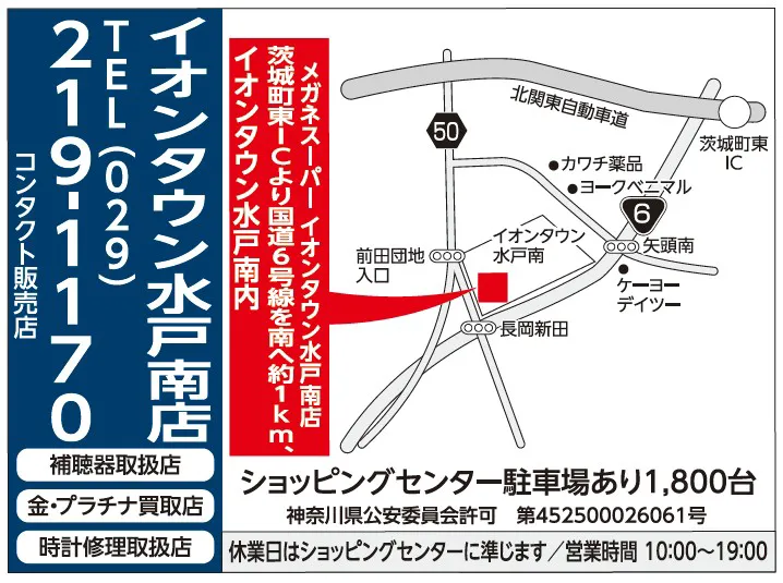 茨城町東ICより国道6号線を南へ約1km、イオンタウン水戸南1階に御座います。