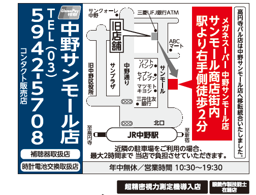 【電車でお越しの場合】JR中野駅北口出て、正面のサンモール商店街内、右手側徒歩2分