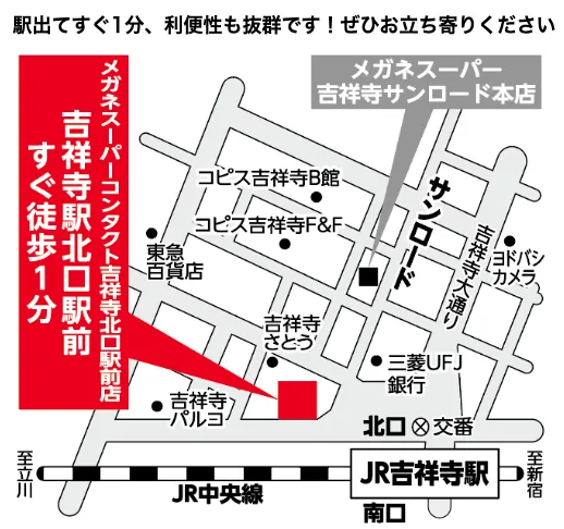その他、近隣駐車場「吉祥寺パーキングプラザ」、「タイムズ吉祥寺南町第4」等ご利用でもご購入の際、店舗滞在時間に応じて最大3時間までは駐車場利用料金をメガネスーパーで負担させていただきます。駐車券をご提示ください。