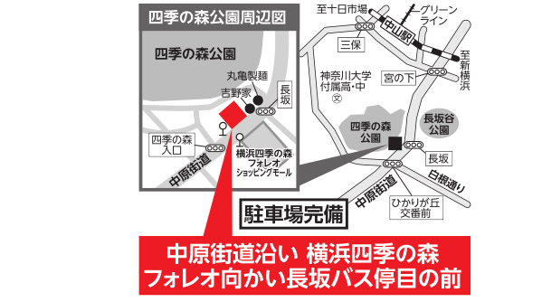 ・中原街道を丸子橋、佐江戸方面に進み、「四季の森入口」交差点を過ぎてすぐ左側
