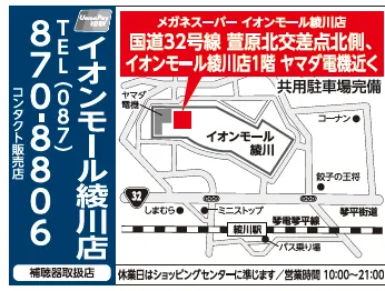 【車】 高松自動車道 府中湖スマートICより5分 高松西ICより15分 高松檀紙ICより20分 国道32号線 菅原北交差点北側 「イオンモール綾川店1階、シネマ側入り口すぐのエスカレーター前、ヤマダ電機・H&M 近く」